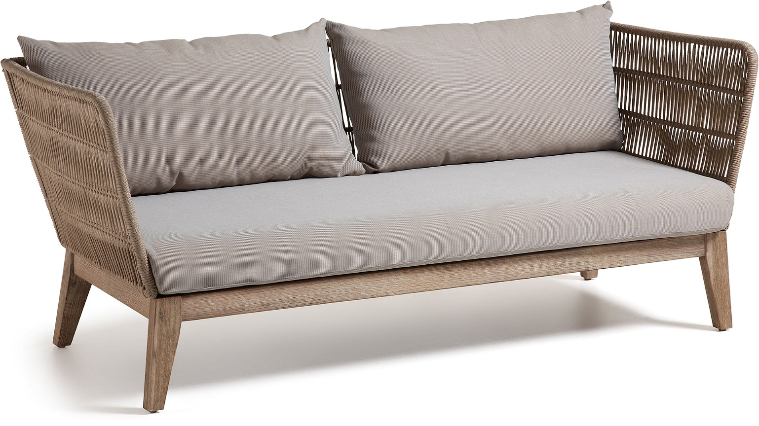 Udendørs 3-personers sofa – Kave Home Belleny i massivt eukalyptustræ med puder og madras, UV-bestandig beige/natur/grå